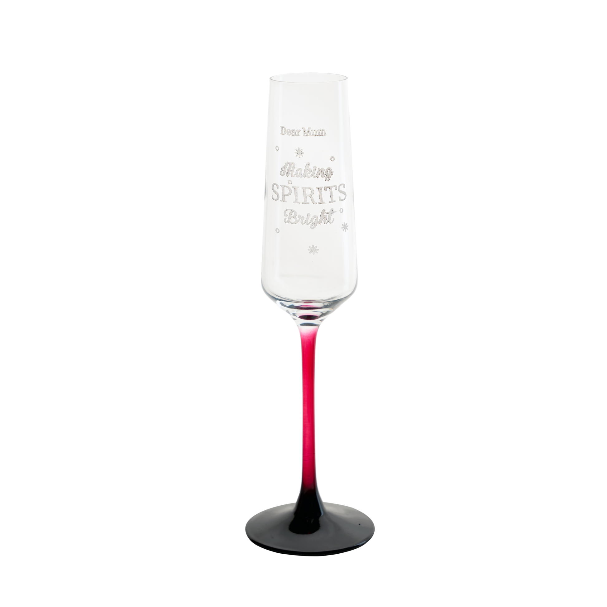 "Dear Mum" engraved champagne flute: "Making Spirits Bright" design—festive glassware, heartfelt holiday gift for mothers.