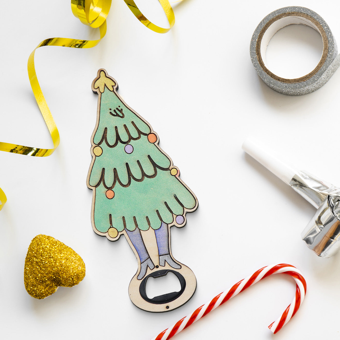 Unique laser-cut Christmas tree bottle opener. A functional and festive addition to your kitchen or holiday party essentials.