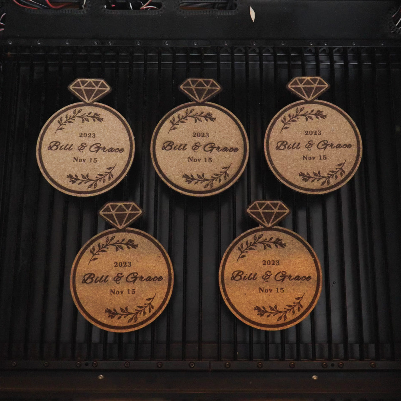 Protect your surfaces with our laser-cut Diamond Ring Shaped Cork Coasters. Crafted with precision, these coasters not only add a touch of sparkle to your décor but also keep your tables safe from moisture and scratches.
