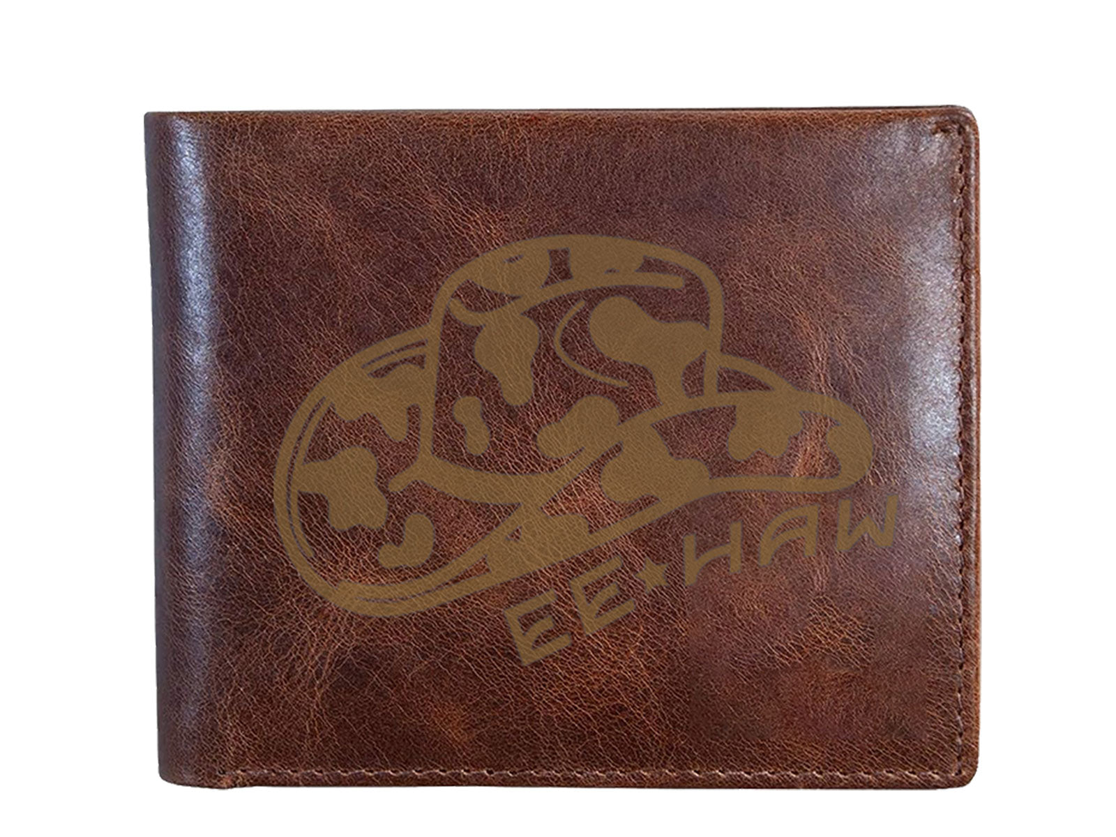 Embrace the wild west with our Western Spirit Engraved 'EE*HAW on a Cowboy Hat' Leather Wallet. With its engraved design inspired by cowboy culture, this wallet exudes rugged charm. Crafted from premium leather, it offers durability and style. Carry a piece of the frontier with you and showcase your cowboy spirit with this unique and eye-catching wallet.
