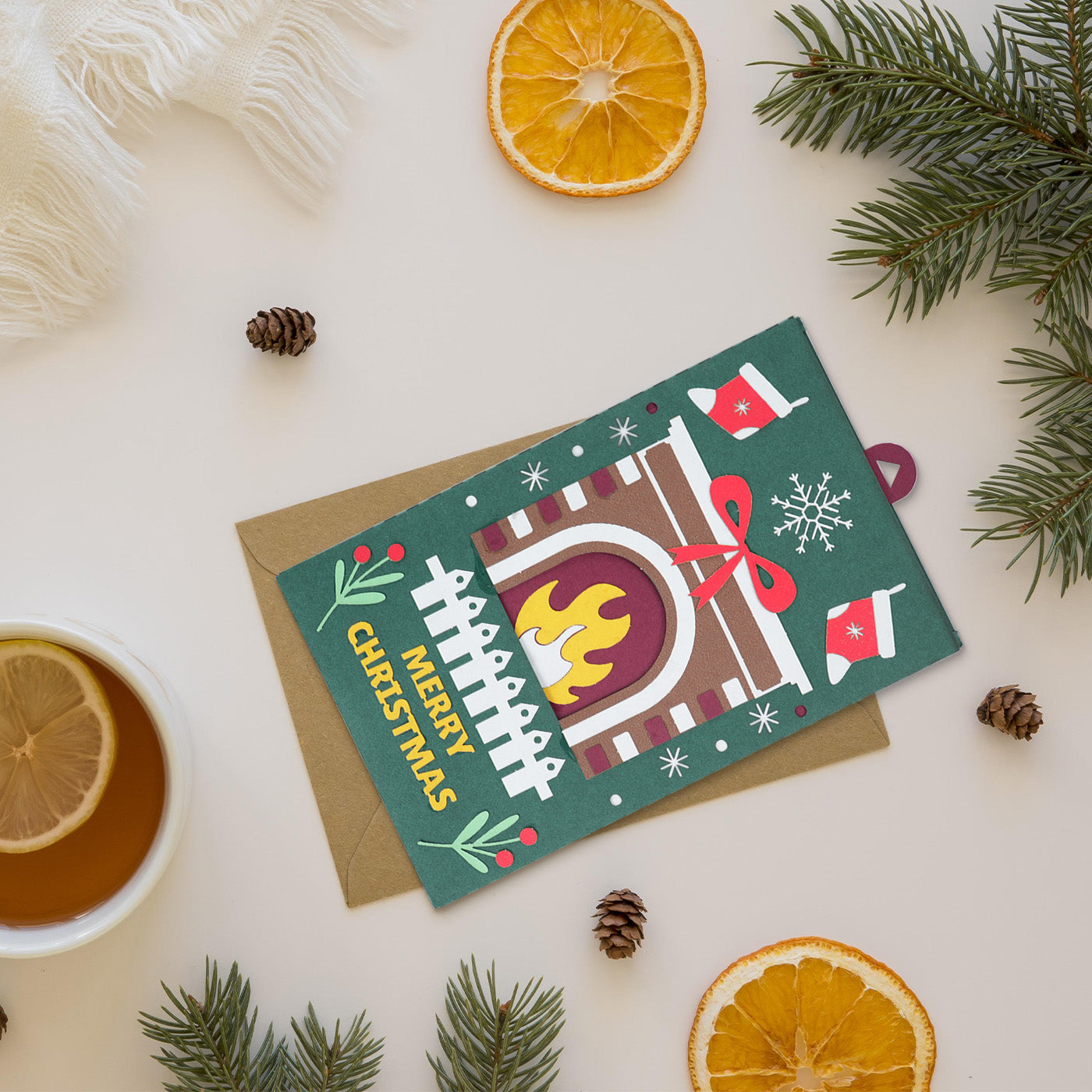 Surprise your loved ones with our unique pull-out Christmas card featuring a charming fireplace design. A delightful way to share holiday cheer!