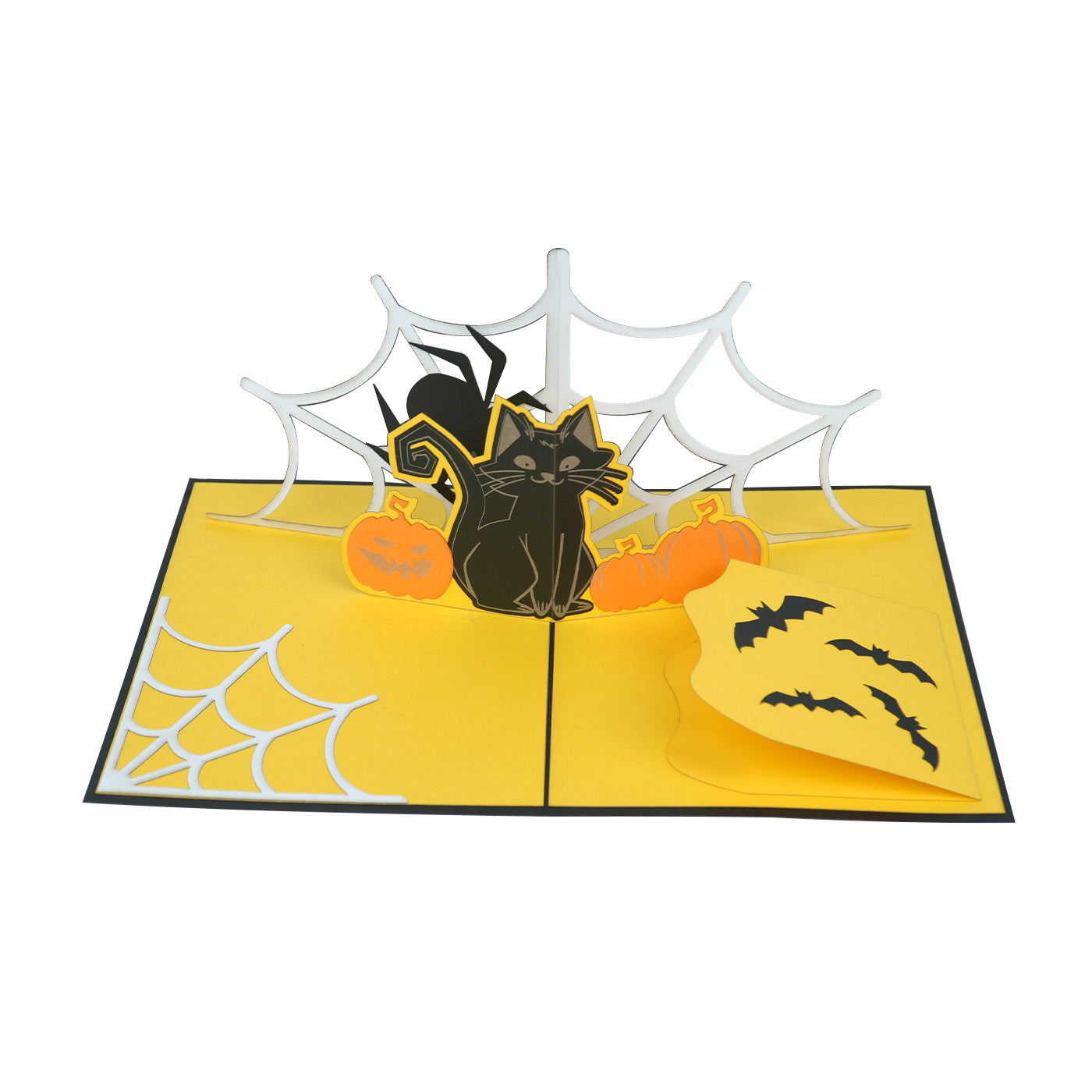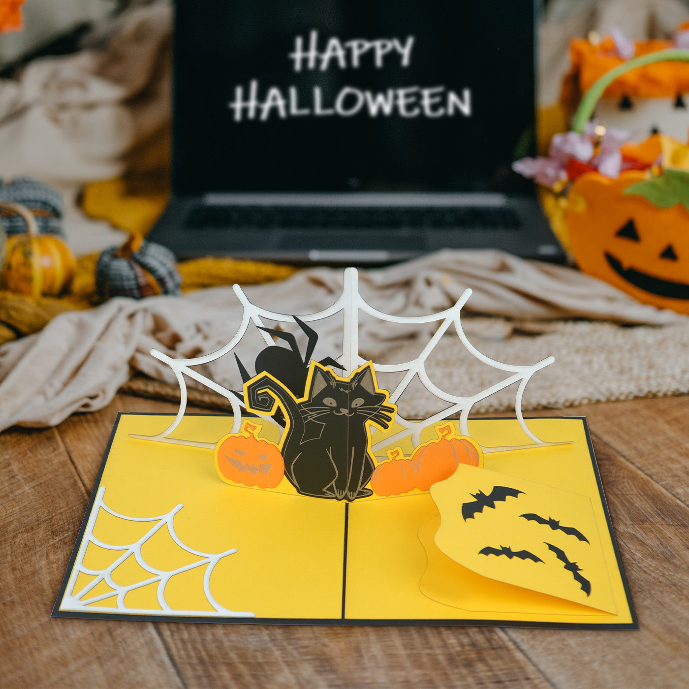 Surprise your friends and family with our laser-cut Halloween Pop-Up Card. This intricate design unfolds to reveal a spooky 3D scene, making it a unique and eye-catching greeting.