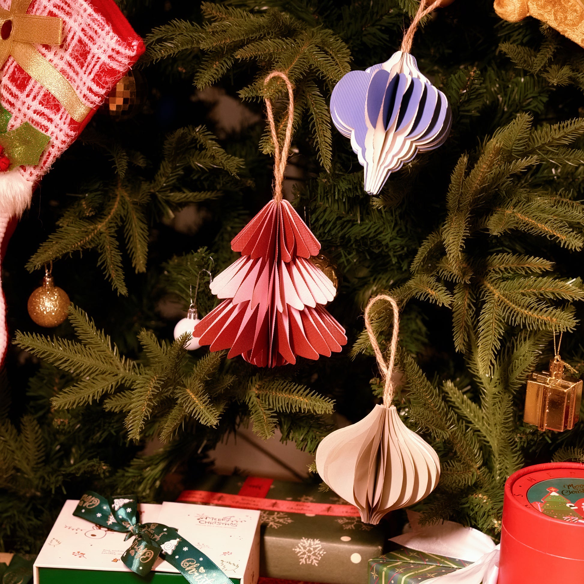 Origami Christmas ornaments: Tree/bauble shapes—colorful folded paper decor, charming holiday gift for tree styling.