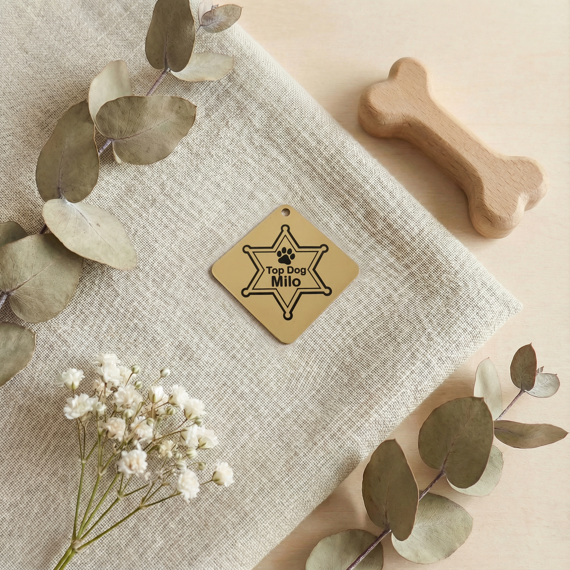 Custom Metal Pet Tag: Sheriff star design, personalized "Top Dog Milo" engraving. Durable, stylish ID tag for dog collars.