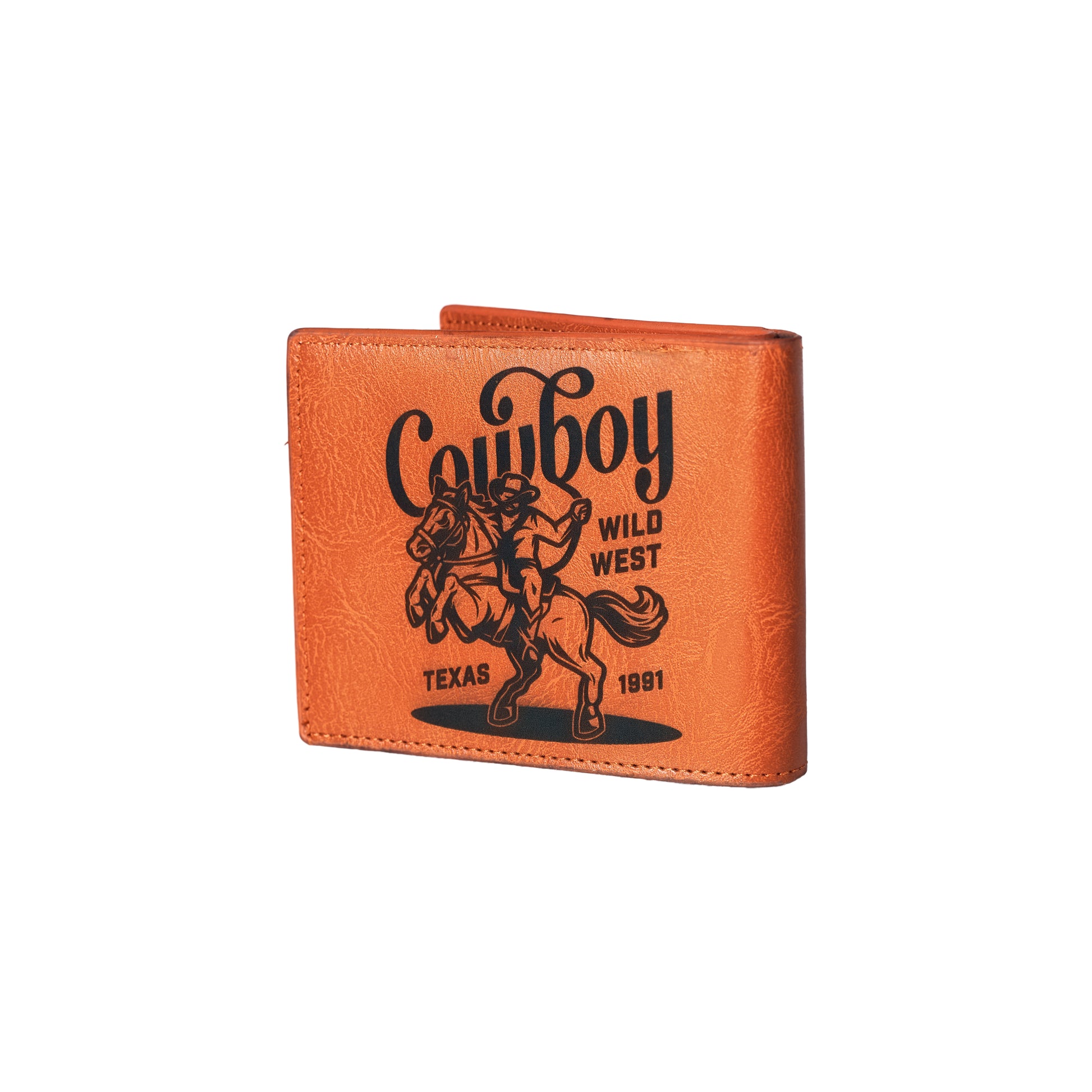 Cowboy-themed leather wallets: Engraved gun/typography designs, rustic style—stylish accessories & Western-inspired gifts.