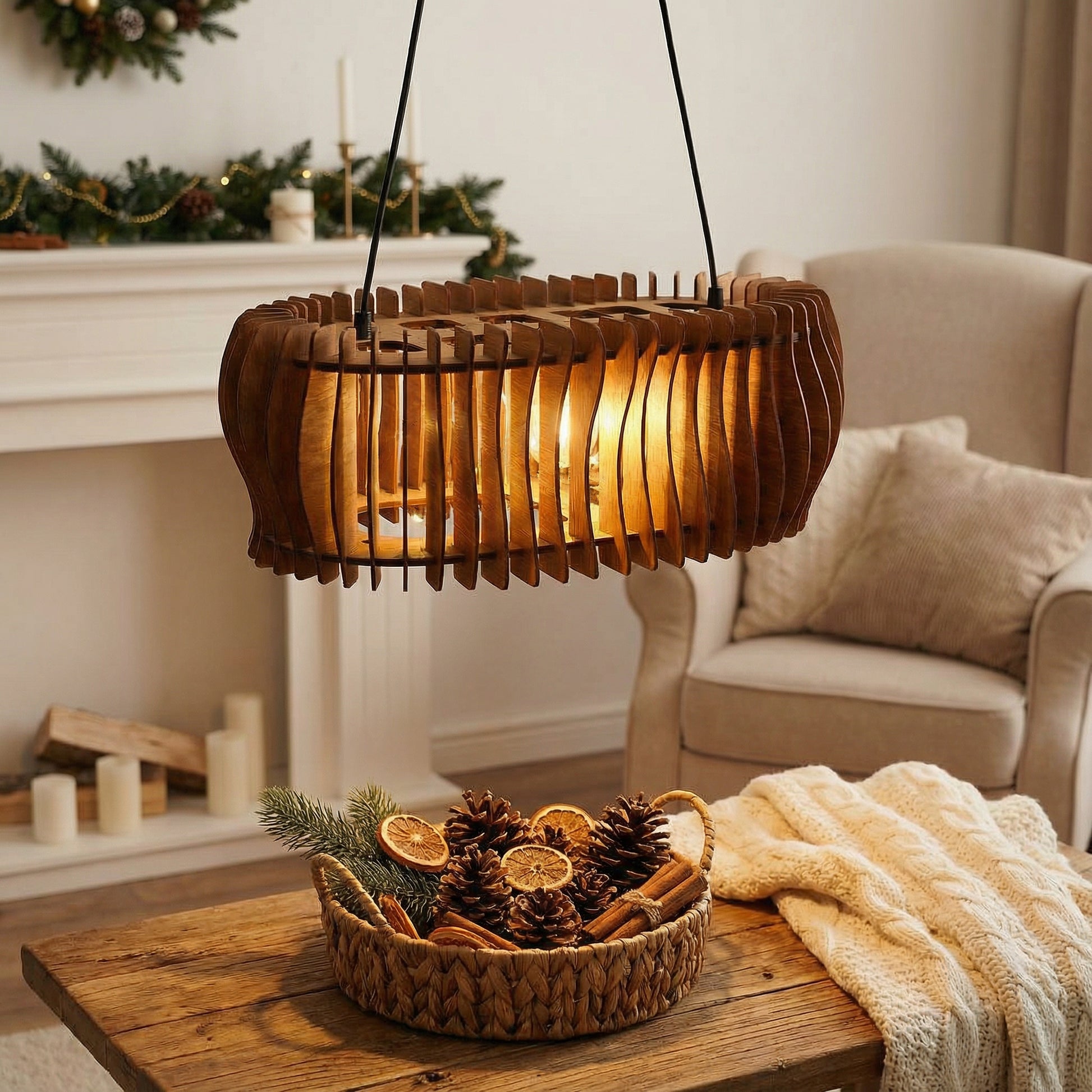 Wooden pendant light: Warm glow, rustic design—festive Christmas decor, cozy holiday home accent piece.